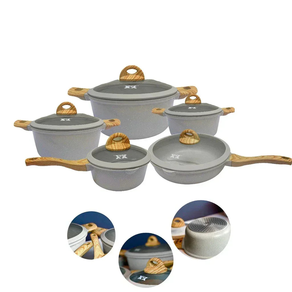 Conjunto completo de panelas com revestimento em granito, garantindo durabilidade e distribuição uniforme de calor.